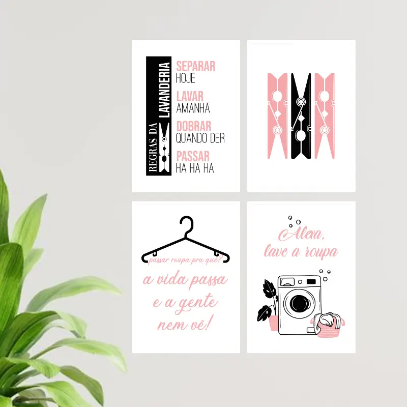 Lavanderia Rosa e Cinza - Separar lavar dobrar passar - Prendedores - Cabide